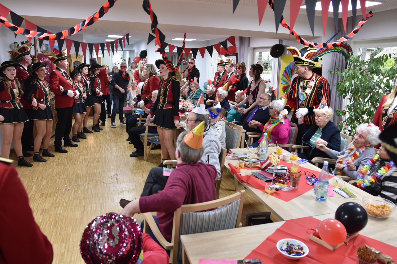 Obwohl die Tagespflege vor Karnevalisten wimmelte, schaffte es eine 5-köpfige Gruppe der Garde ihren Showtanz vorzuführen. Gerne klatschten dazu die Tagespflegegäste im Takt. Der tolle Besuch endete mit dem Auszug, den erneut Fanfaren und Trommeln einläuteten. Die Diakonie-Tagespflege ist dabei einer von vielen Auftritten des Prinzenpaares, weitere folgten bis in die tiefe Nacht hinein. Der Karneval bringt Freude in die Säle und Räume und er vergisst dabei auch die älteren Mitmenschen nicht. „Vielen Dank für euren Besuch“, sagte Hans-Dieter Reuter, Teamleiter der Tagespflege an der Parkstraße. Helau!