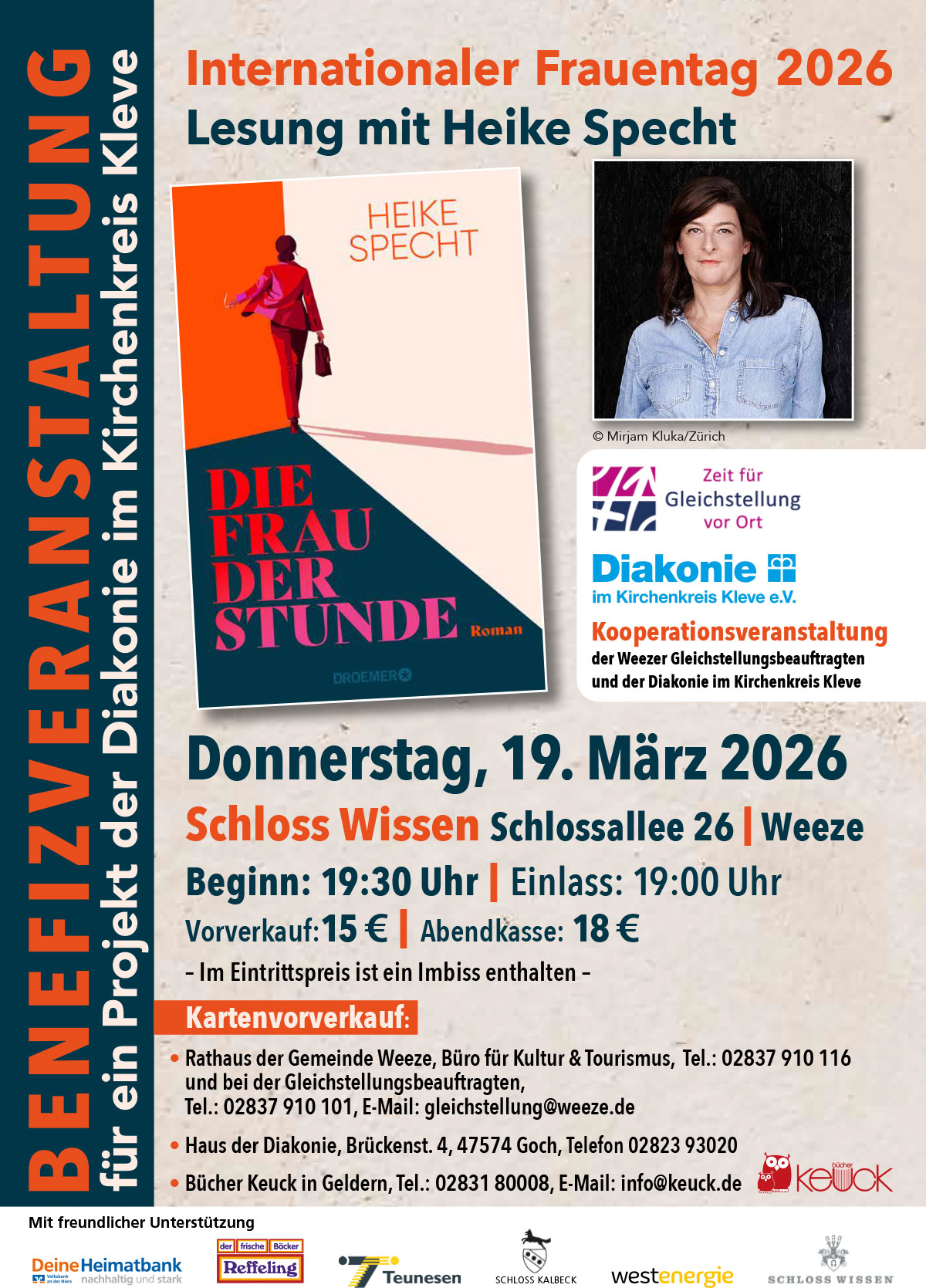 Weeze. Der Internationale Frauentag am 8. März erinnert an die Rechte der Frauen und die Gleichstellung aller Menschen. Einige Tage später, am Donnerstag, 19. März, laden die Gleichstellungsbeauftragte der Gemeinde Weeze, Nicola Roth, und die Diakonie im Kirchenkreis Kleve erneut gemeinsam zu einer Benefizveranstaltung ein. In diesem Jahr wird Autorin Heike Specht ihren aktuellen Roman „Die Frau der Stunde“ auf Schloss Wissen vorstellen.