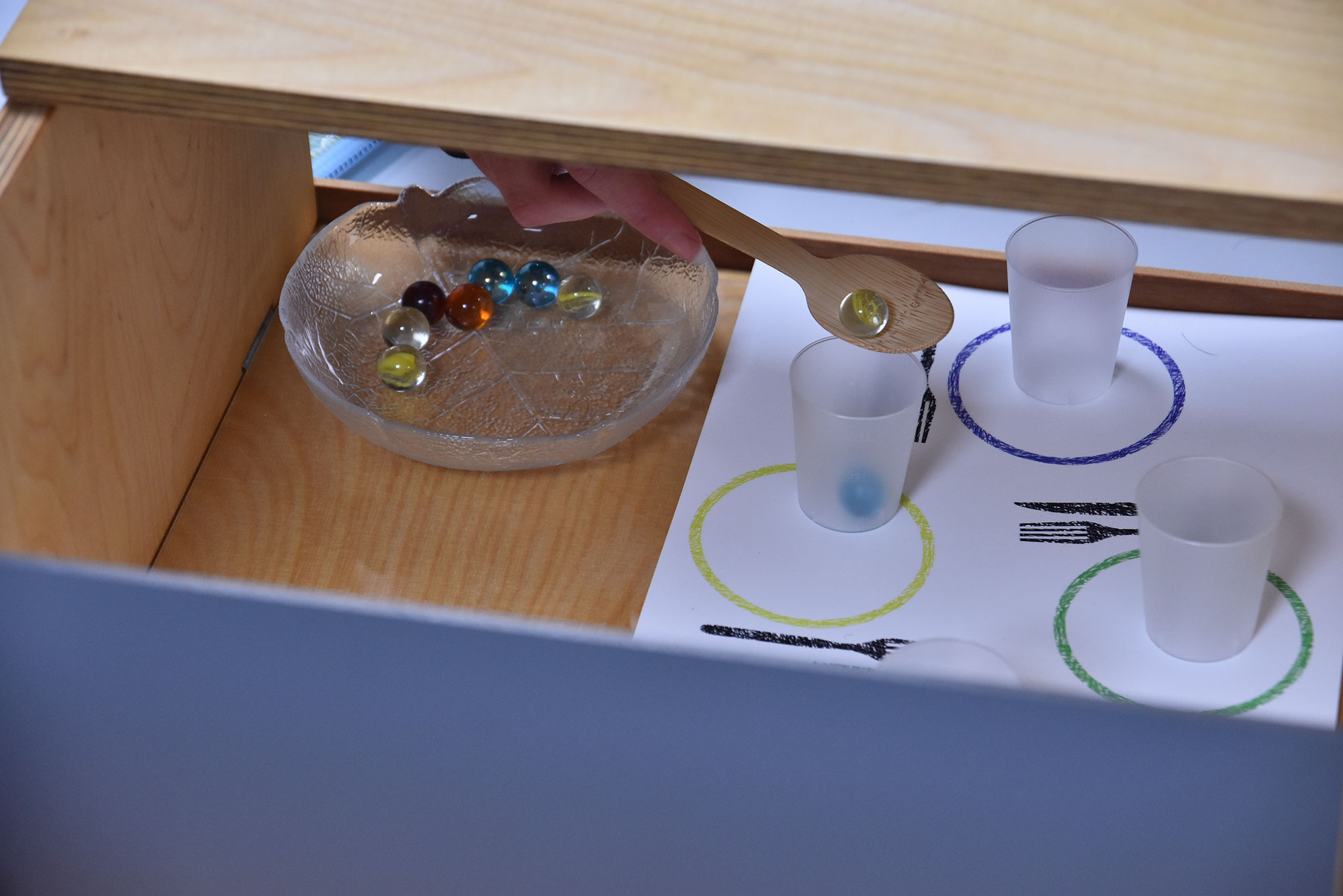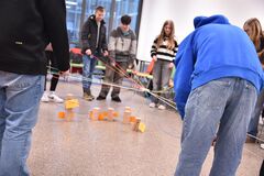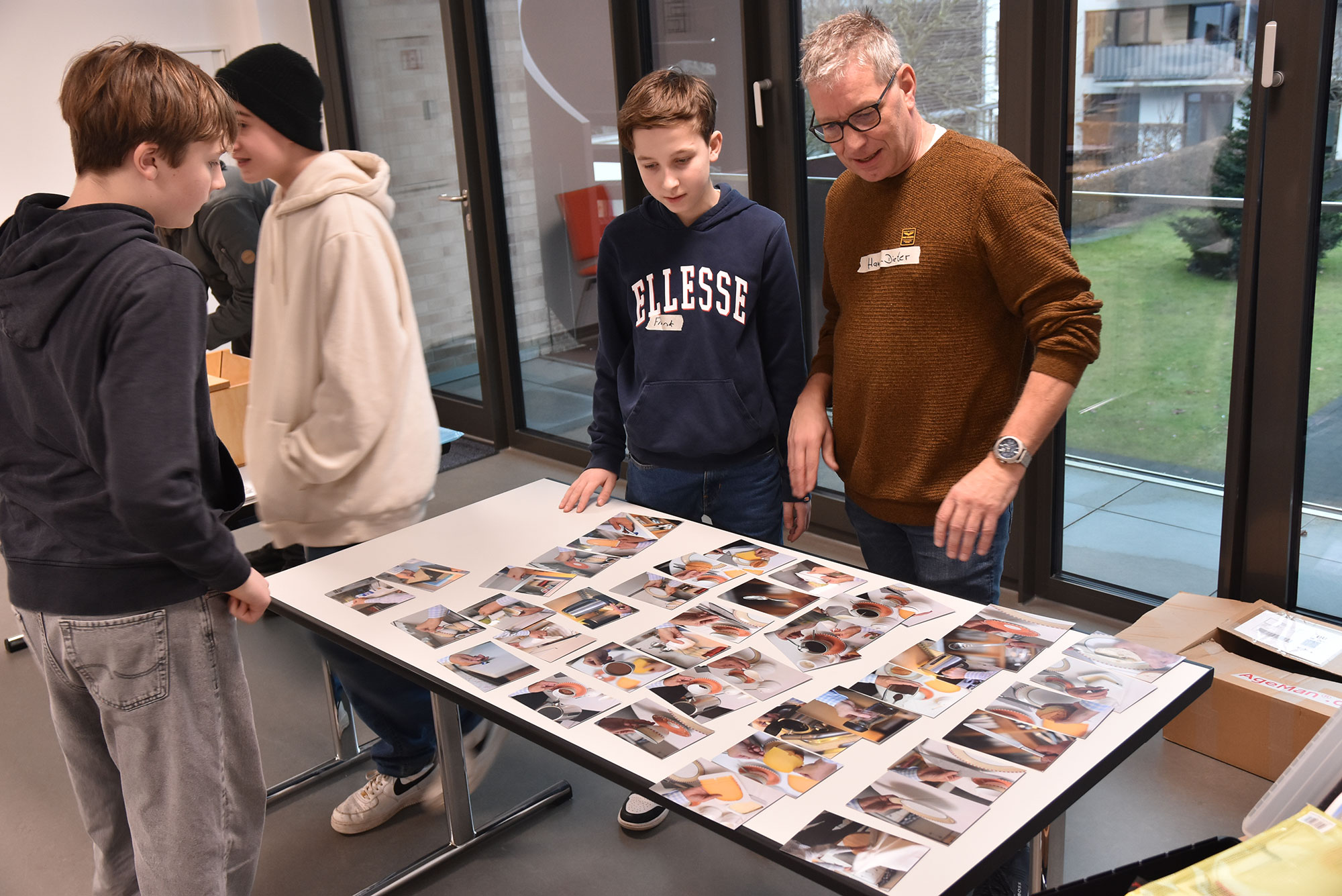 Ebenso beschwerlich wie eindrücklich waren die Versuche der Konfirmand:innen, leichte Geschicklichkeitsübungen unter erschwerten Bedingungen zu koordinieren. Zum Beispiel mit Handschuhen einen Kittel zuzuknöpfen, oder mit Messer und Gabel zu hantieren, wenn die Sicht erschwert ist. Wenn altersbedingt Konzentration, Koordination und Geschwindigkeit nachlassen, kann selbst das Zubereiten vom morgendlichen Frühstück eine längere Aktion werden, das zeigte ein Fotosuch- und Erinnerungsspiel.