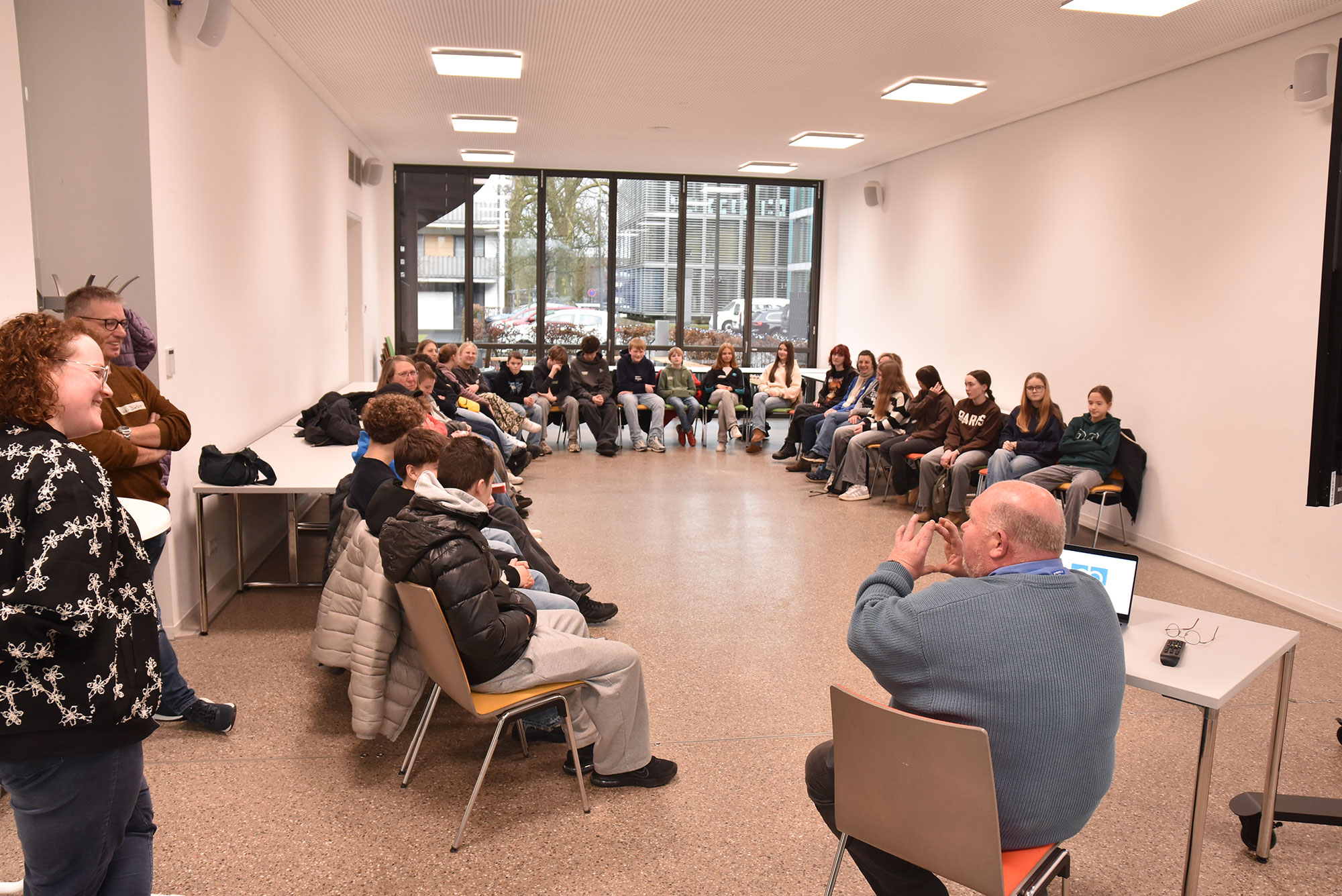 Dass die Diakonie ihrem christlichen Ursprung vor allem durch die Unterstützung von Hilfebedürftigen und Ratsuchenden Ausdruck verleiht, zeigte nicht nur der Jubiläumsfilm „175 Jahre Diakonie in Deutschland“, sondern auch die Workshops mit Diakoniemitarbeitenden. Hans-Dieter Reuter, Verbundleiter der Diakonie-Tagespflegen, legte den Konfirmandinnen und Konfirmanden Gewichte an Arme, Beine und auf die Schulter. Sie simulierten, wie sich Bewegung im Alter häufig anfühlt. Mal fünf Minuten waren kein Problem, dauerhaft wollte es jedoch keiner der jungen Leute tragen.