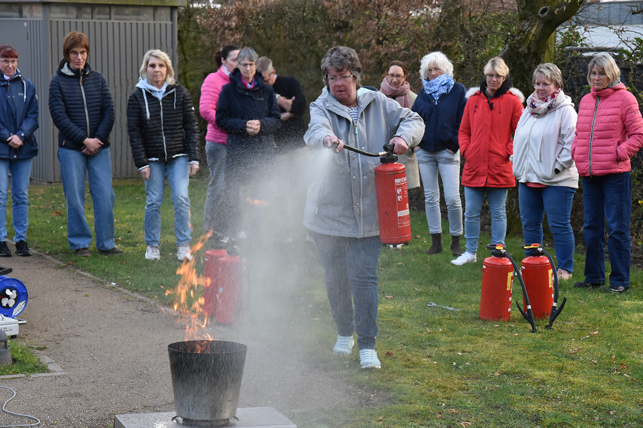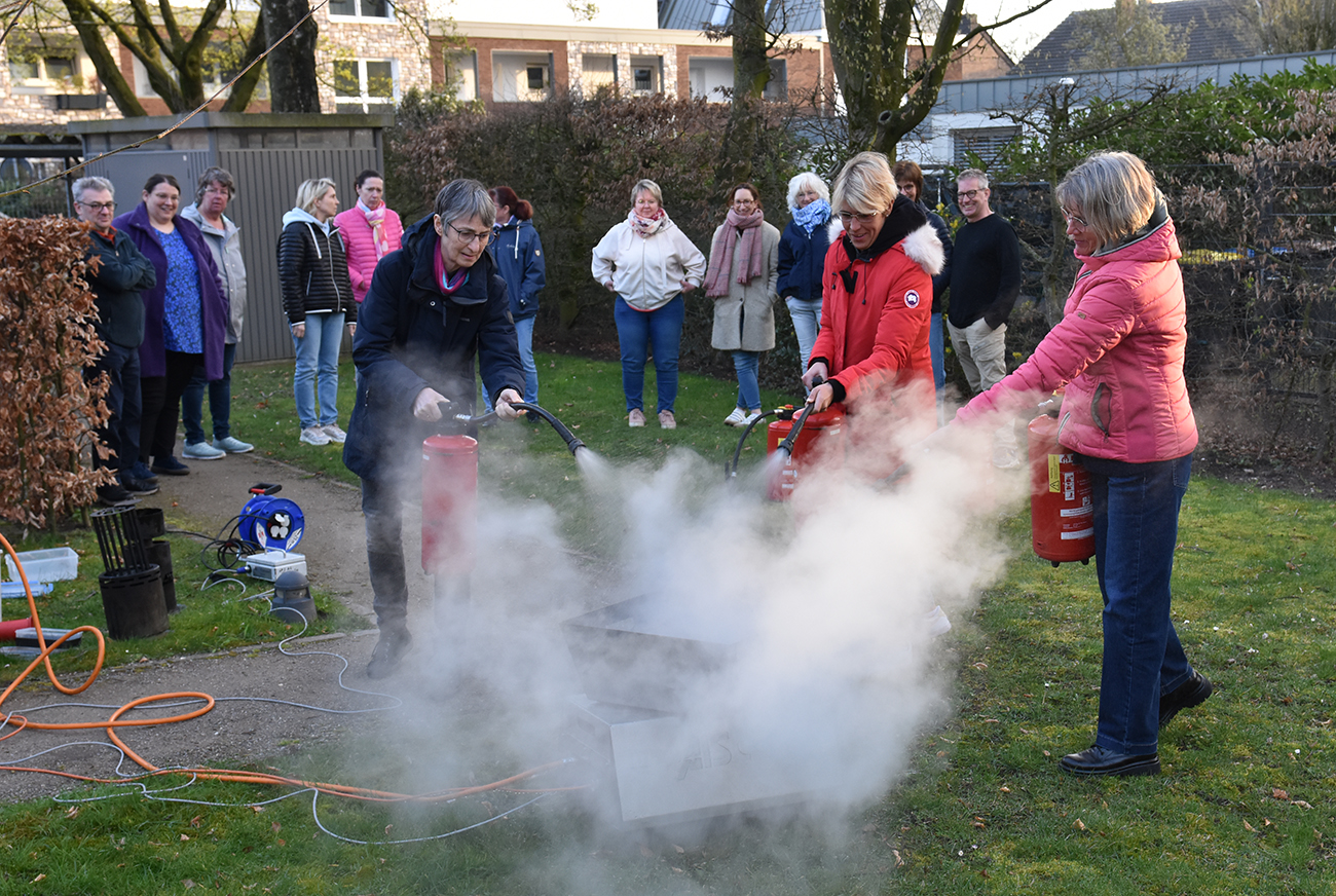 Jedes Haus hat einen oder mehrere Feuerlöscher. Wie diese anzuwenden sind, konnte die Mitarbeitenden der Tagespflegen mehrmals ausprobieren. „Wenn Feuer nicht durch Wasser gelöscht werden können, sorgen Sie dafür, dass alte Decken greifbar sind, mit denen Sie den Brand zudecken können“, gab von Quistorp noch als Tipp. Die Brandschutzhelferausbildung müssen Mitarbeitende spätestens alle 5 Jahre wiederholen.