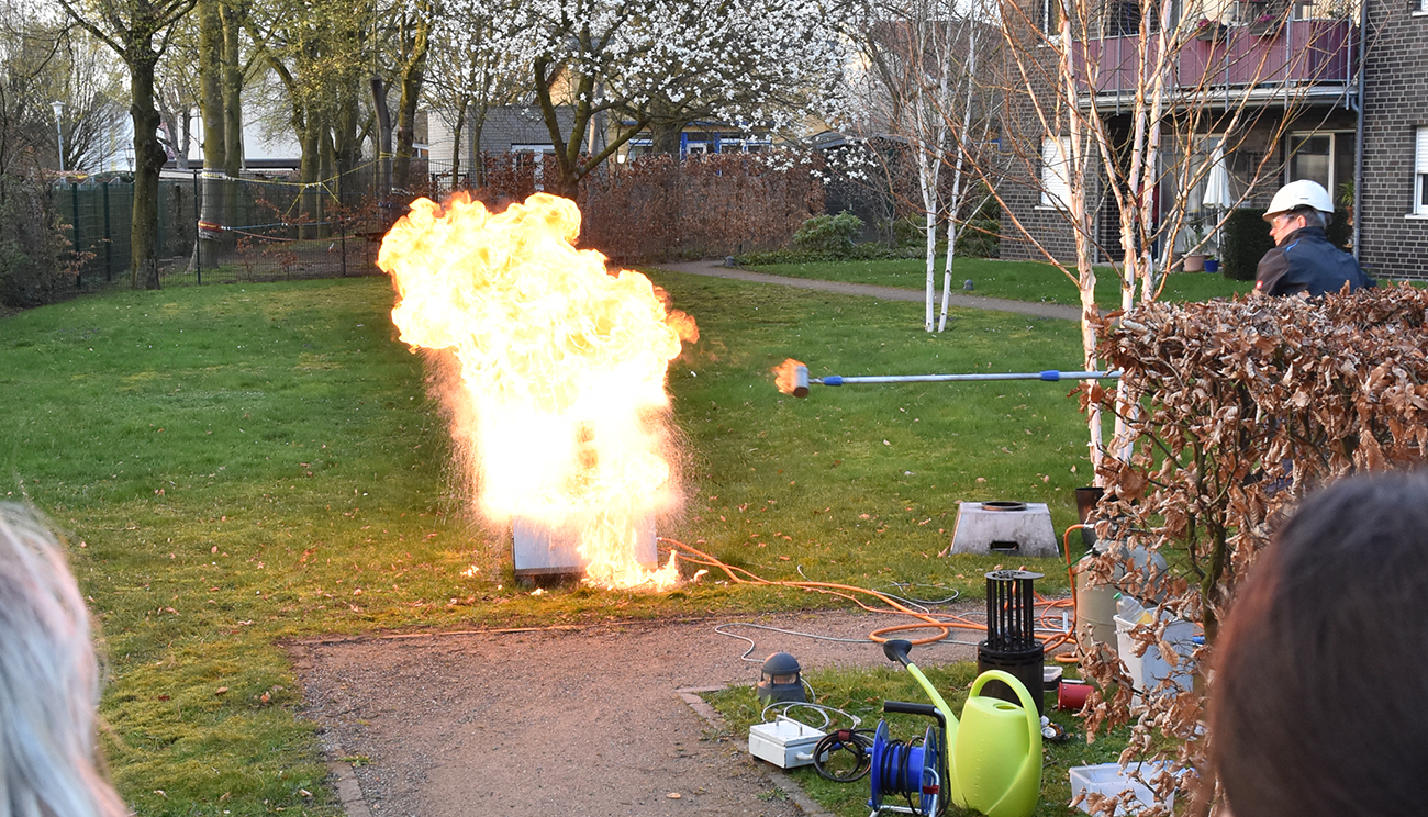 „Lassen Sie nie Dinge auf dem Herd liegen, der auch durch unbemerkte Berührung angeschaltet werden kann“, so von Quistorp. Ebenso ungewollte Konsequenzen kann unbedachtes Verhalten an anderen Stellen haben: Eine mit Druckgas befüllte Kosmetikflasche kann hinter Fenster- und Autoscheiben durch Erhitzung explodieren. Wie laut das ist, demonstrierte die Expertin den Teilnehmenden im Tagespflegegarten. Auch Akkus von E-Bikes sollte man nicht im Hochsommer an hitzeabstrahlenden Häuserwänden stundenlang stehen lassen. Handys sollten am besten nicht unbeobachtet nachts am Ladekabel bleiben, schon gar nicht neben dem Bett.