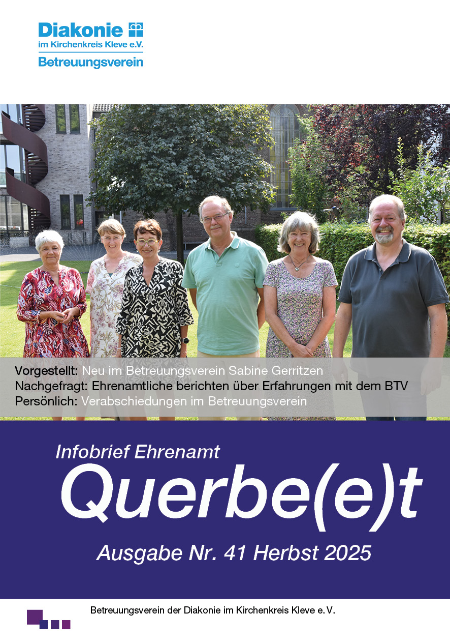 Die „Querbe(e)t“ ist das Betreuermagazin des Betreuungsvereins. Es erscheint zwei Mal im Jahr kostenlos. Das Magazin enthält Erfahrungsberichte von anderen Betreuern, Wissenswertes rund um die Themen rechtliche Betreuungen, Gesetzesänderungen im Betreuungsrecht, Unterhaltsames und vieles mehr. Im Querbe(e)t-Archiv auf dieser Seite können die einzelnen Ausgaben durch Anklicken des Titelbildes online abgerufen werden.